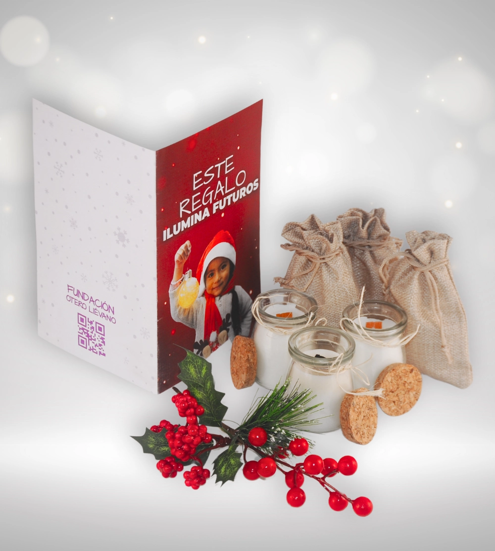 Con tu donación, recibirás una tarjeta física personalizada y tres velas aromáticas, llevando calidez y esperanza a quienes lo necesitan, mientras compartes el espíritu navideño con un detalle especial.